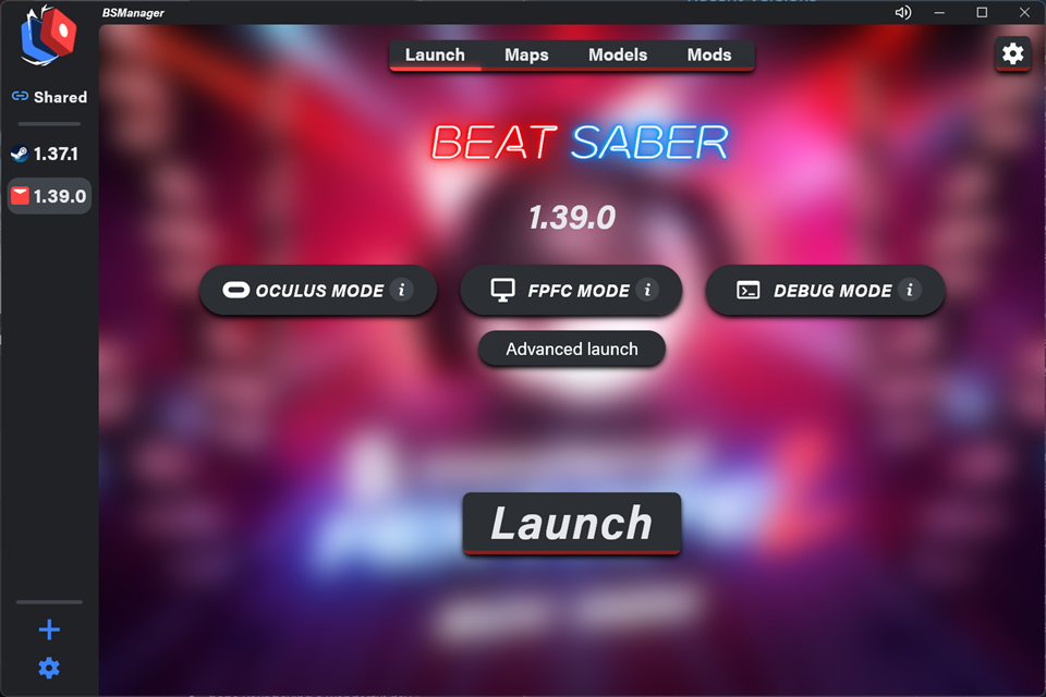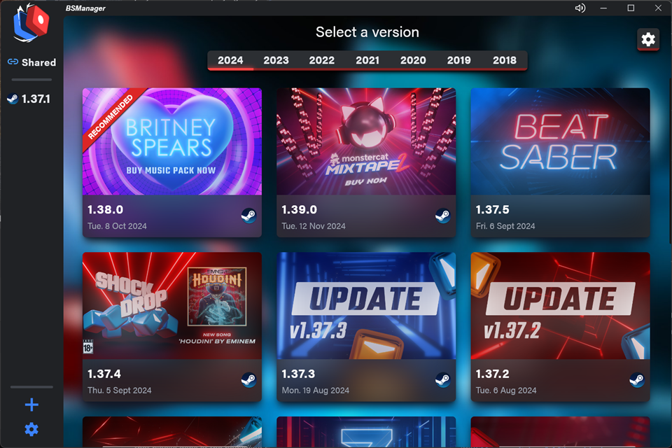 - You can also install other versions! If you want to install another version, select the blue + icon on the bottom left and pick a version to download. You will need to login with either your Steam account or provide an Oculus Token to prove that you own a valid copy of Beat Saber. There will be dialogues to help you through this part.