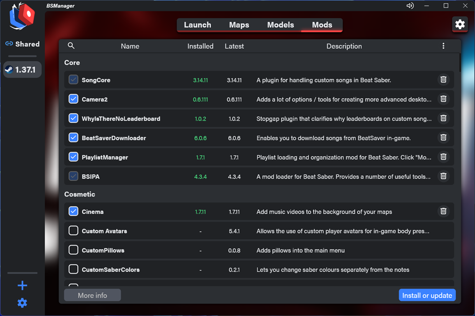 - Once it's done, you'll find your current version on the left. You can click on it to select your launch options, view and install maps or models, and install mods! Just click the ones you want and select the Install or update button. We recommend against installing every mod at first as you’ll likely be overwhelmed by all the new options - and you may run into issues. Instead, take the time to learn about what each mod does. You can also click on the "More Info" button after selecting a mod to read more about it.
