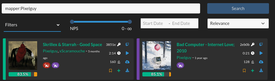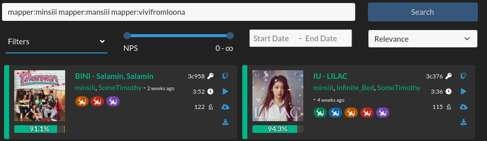 Using the mapper: keyword will only show maps uploaded by the mapper and not collaborations. This can allow you to search maps of a given mapper with the known filters and search terms.