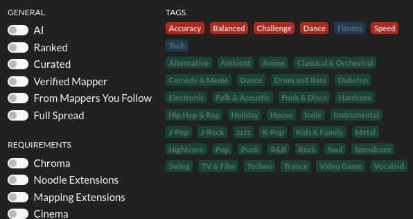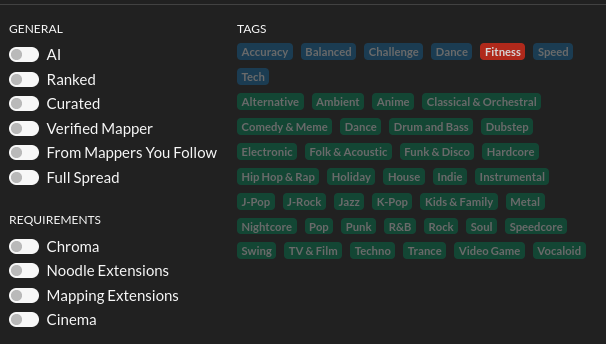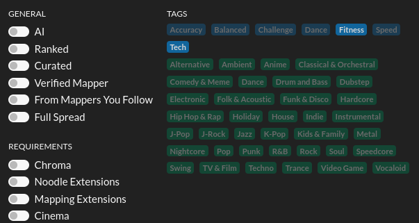 The results from the image above will now show you maps that either have the "Fitness" or "Tech" or both tags. If you were trying to find maps that are techy Fitbeat maps you cannot find them this way though.